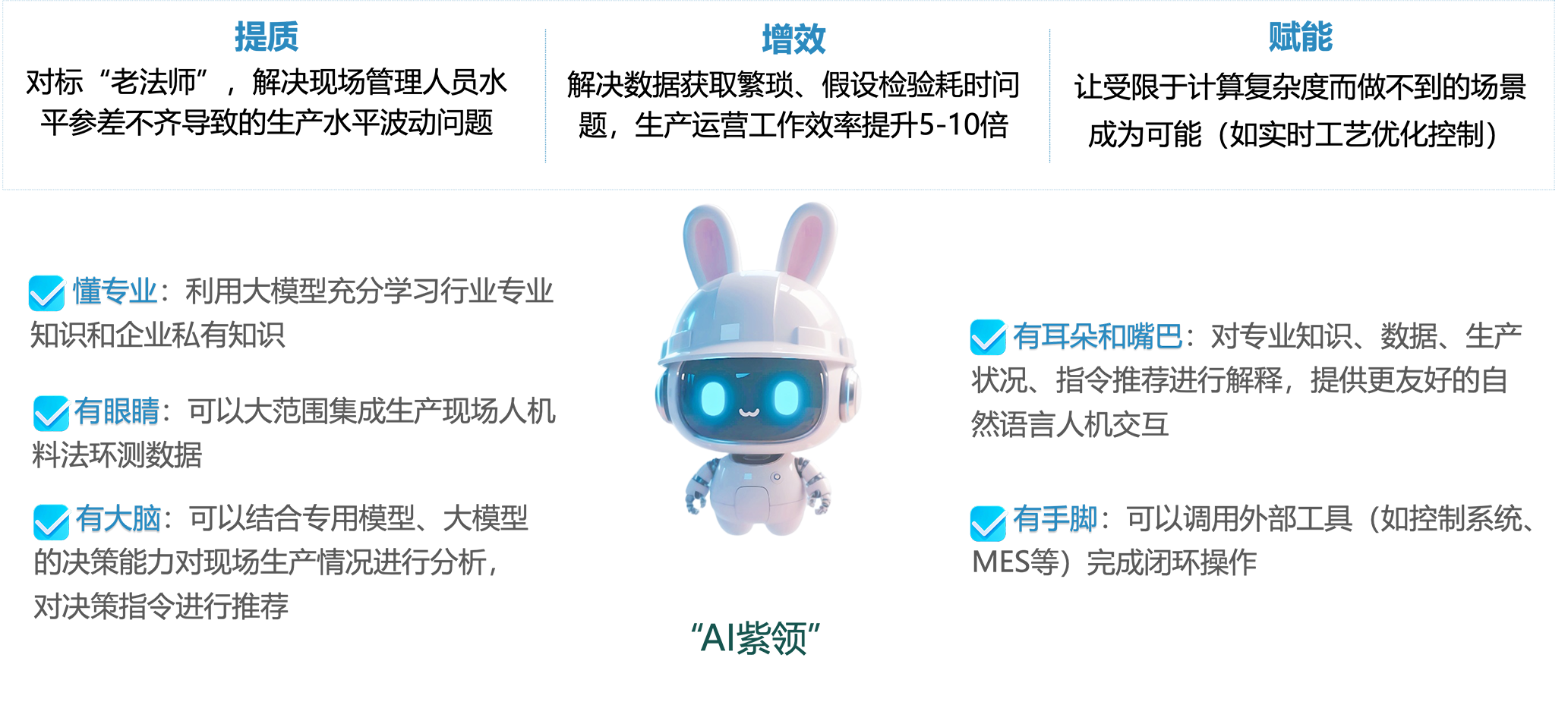 与工业企业紧密协作,高效集成与管理生产现场人、机、料、法、环、测各类数据资产以及知识资产,利用AI从数据中获取业务洞察,辅助人预测和诊断问题、形成行动,持续改善各项关键指标,让设备、人员和工厂更有生产力。
