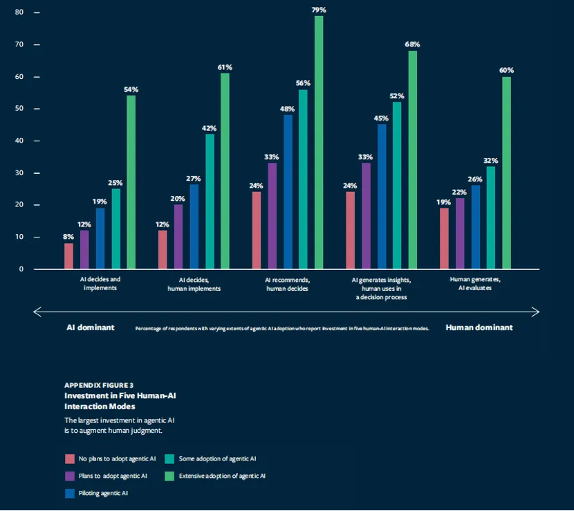 传统组织设计围绕人展开,智能体颠覆了这一逻辑。高管需思考“人类与智能体并肩工作时,组织结构应是什么样子”。调查显示,45%广泛采用智能体的组织预计中层管理岗位会减少。